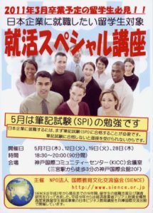 投稿日: 2009年4月8日2024年1月17日神戸の就活スペシャル講座 外国人留学生対象SPI対策講座 5月は神戸の就活スペシャル講座でSPIを教えます。 外国人留学生の皆さんは日本人より早めに対策を行おう! わかりやすく教えるから、みんながんばろうぜ! 平成21年5月SPI対策4日間チラシ2009ダウンロード