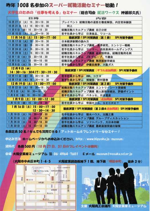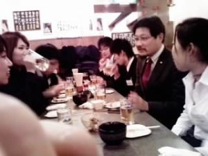 産業創造館地下1階の企業家ミュージアム「仕事を考えるセミナー」も今年の最終回です。終了後、受講生、神瀬さん、熊谷さんの総勢12名で飲み会へと繰り出したのですが、どこも満席状態!!ようやく見つけた居酒屋でカンパーイ!!就職活動の話で盛り上がりましたと言いたいところですが、色恋沙汰、彼氏に関するナマナマシイ話で盛り上がったのでした。