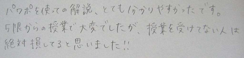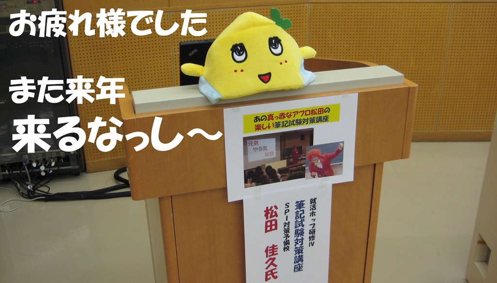 あっという間に2コマ終了です。皆さんお疲れさまでした。次は来年4月前後に。今日休んだ方もご安心を!録画した講義をDVDに焼いておきますから。それでは、3限目の就職支援室の田岡先生の講義もがんばってね~\(^o^)/