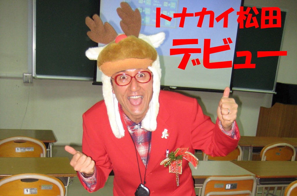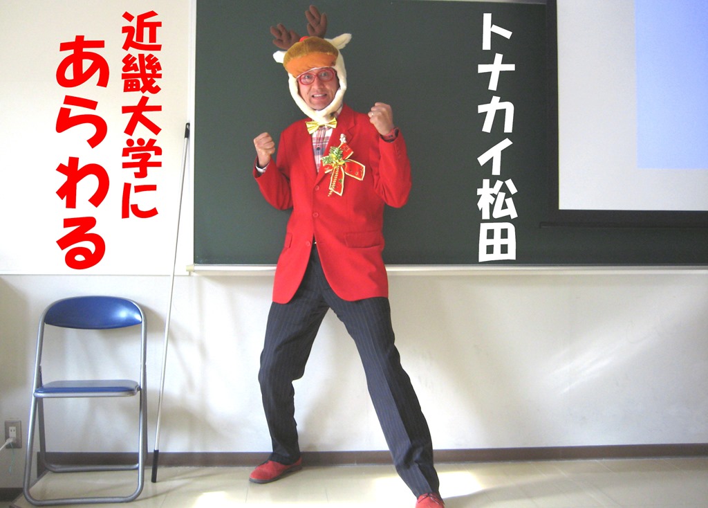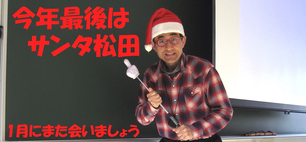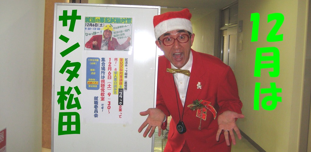 毎年恒例の行事ですが、クリスマス前はサンタ松田になります。大阪夕陽丘学園短期大学さんの1コマ目サンタ松田、2コマ目ふなっしー松田です。