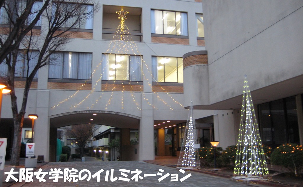 続きましては大阪女学院短期大学さん。大阪キリスト教短期大学さんと同様、キリスト教系の学校です。クリスマスのイルミネーションで彩られてます。