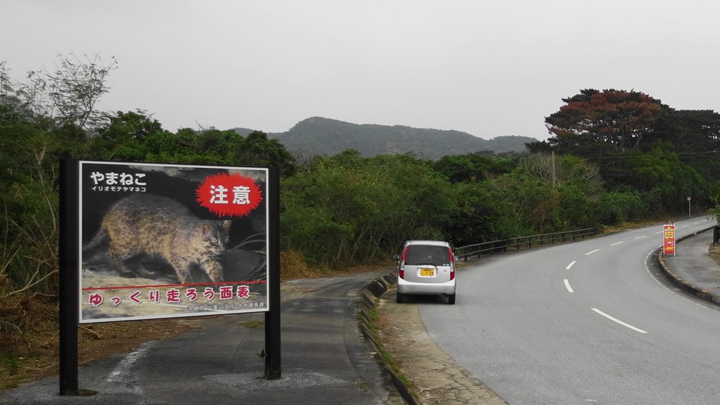 イリオモテヤマネコ注意!の看板や道路標識がいたるところに。