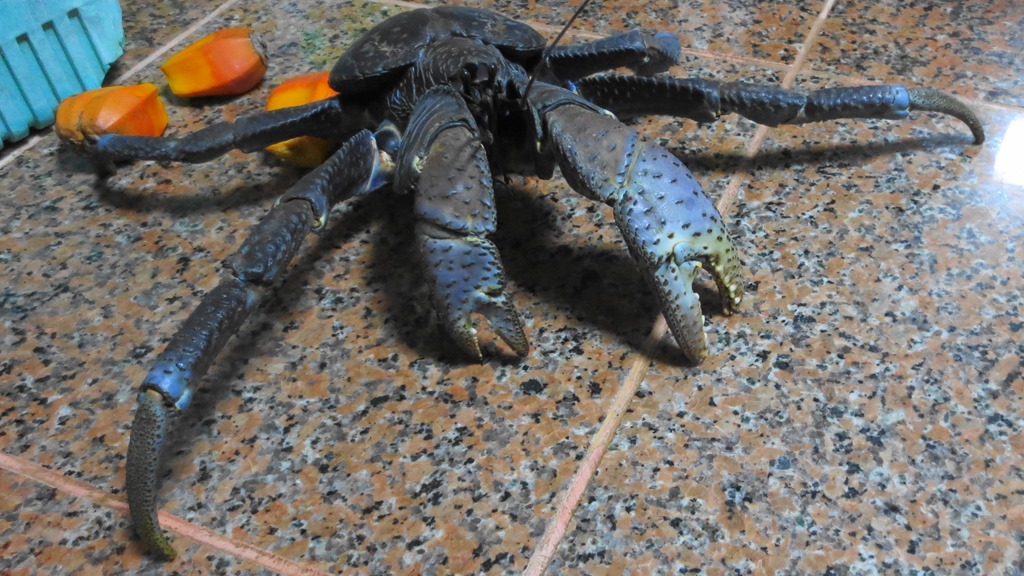 宿のクーラーボックスにヤシガニが‥。近い将来、食べられる運命‥。