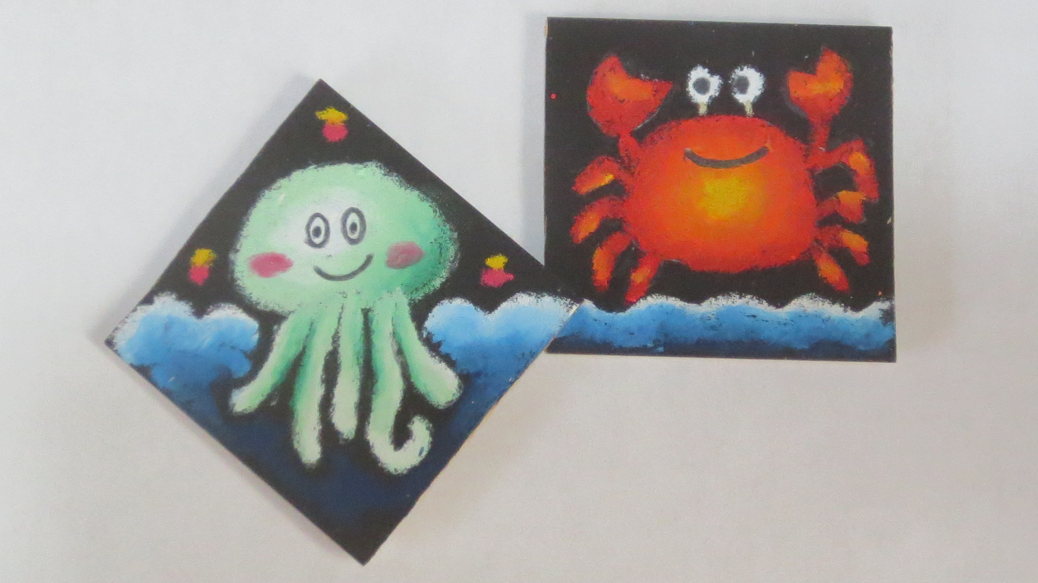 海月と蟹を描きました。まるで小学生の絵みたいですが、可愛らしく描けたと思います。色んな見本が30枚ぐらいあって、その中から好きなのを2枚選ぶのです。最初に下絵を鉛筆で書いてから、チョークを塗っていきます。塗ったチョークを指で混ぜ伸ばして、上手に濃淡を表現出来たら完成です。30分程ですが、とても楽しかったです。偶には芸術に触れる事も必要ですね。
