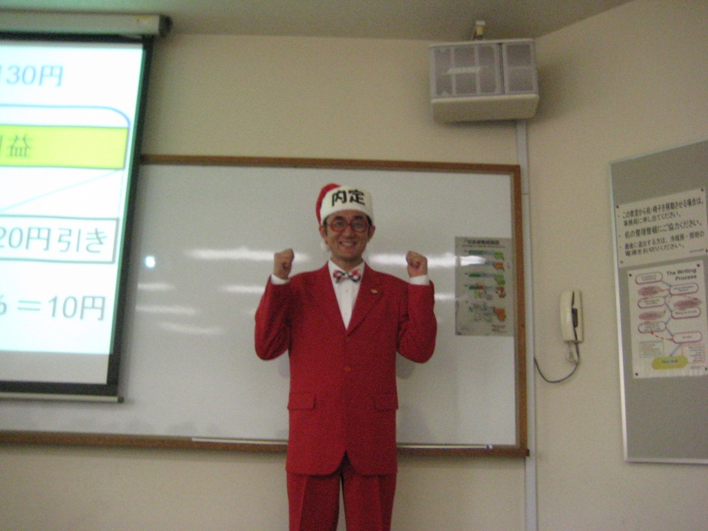 でも、もっと喜んでくれたのは、先生方からのクリスマスプレゼント~!。毎年、付属幼稚園からサンタクロースの衣装を借りられているんです。サンタとトナカイでベリーグッドなツーショットになりましたよ。私もプレゼントを頂きました。藤田先生、山田先生ありがとうございました。次回の来年1月が最終回です。頑張ろうぜぇ。