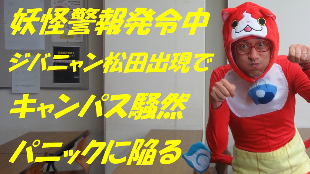 四天王寺大学では、ジバニャンのカブリモノしてすれ違う学生さんに「ウィーッス!ウィーッス!ウォッチ!今何時~?」と言ったり、妖怪体操第一を踊ってたニャン!。すると、警備員や大学職員がぞろぞろ現れて「どちら様?」と尋ねられたニャン。ふざけて「地縛霊のネコでジバニャンにゃ~」と答えたら、不審者扱いされたニャン(>_<)