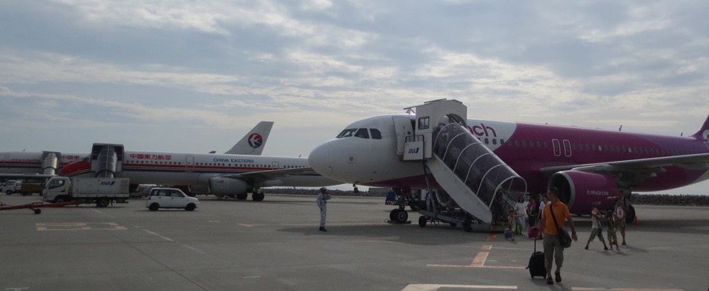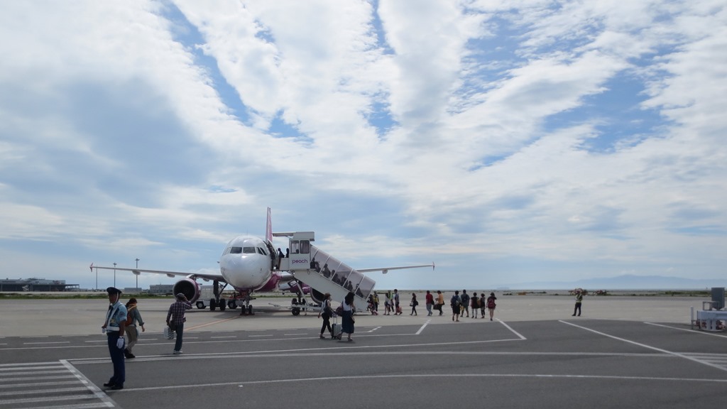 ピーチはボーディングブリッジを使いません。飛行機まではバスや歩きです。